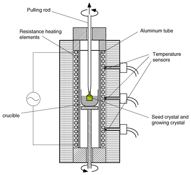 通常单晶硅是在单晶硅生长炉中通过提拉法在惰性气氛下生产取得单晶硅锭,首先高纯度硅料加载到圆形石英坩埚中进行融化,之后由一根夹持有硅籽晶棒的钼材料夹头零件,将硅籽晶棒浸入熔融的硅料之中进行拉晶生产。
